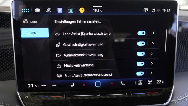 • Fahrassistenz-System: Abbiegebremsfunktion und nAusweichunterstützung, Ablenkungs- und Müdigkeitserkennung, Autom. Distanzregelung (ACC inkl. Stop&Go-Funktion), Berganfahr-Assistent, Fußgängererkennung, Memoryfunktion für Park Assist, Notbremsassistent Front assist mit Fußgänger- und Fahrraderkennung, Parklenkassistent (Park AssistPlus) inkl. Einparkhilfe vorn und hinten, Spurhalteassistent (Lane Assist) inkl. Stauassistent, Spurwechselassistent (Side Assist) mit Auspark-Assistent und Ausstiegswarnung, Verkehrszeichenerkennung