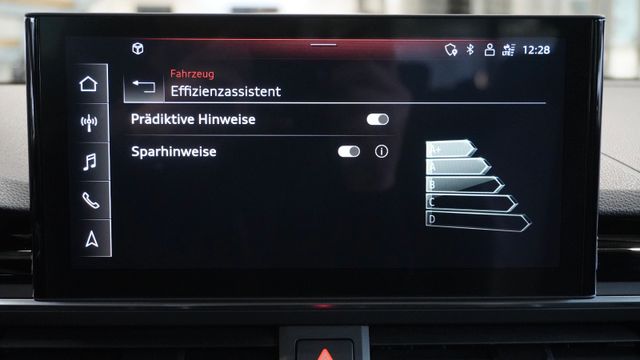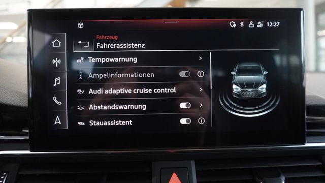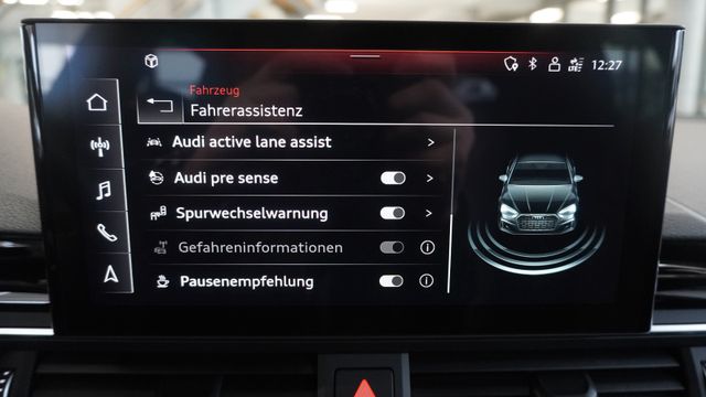 • Assistenz-Paket Fahren, Fahrassistenz-System: Spurwechselassistent (Side Assist), Fernlichtassistent, Verkehrszeichenerkennung, Fahrer-Informations-System (FIS) mit Farbdisplay, Fahrassistenz-System: Adaptive Geschwindigkeitsregelanlage (Adaptive Cruise Control) mit Autom. Distanzregelung, Fahrassistenz-System: Insassen- Schutzsystem (Audi pre sense basic) inkl. Audi pre sense rear, Stauassistent, PrĂ€diktiver Effizienz-Assistent, Ausweich-Assistent, Abbiege-Assistent links, Spurhalteassistent (active lane assist)Assistenz-Paket Parken Einparkhilfe vorn und hinten, akustisch und optisch mit selektiver Anzeige (APS Plus), RĂŒckfahrkamera, Anfahr-Assistent (hold assist)