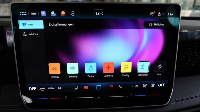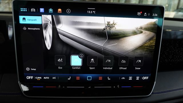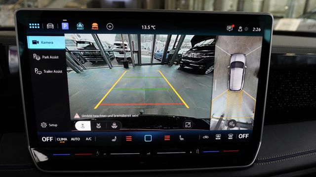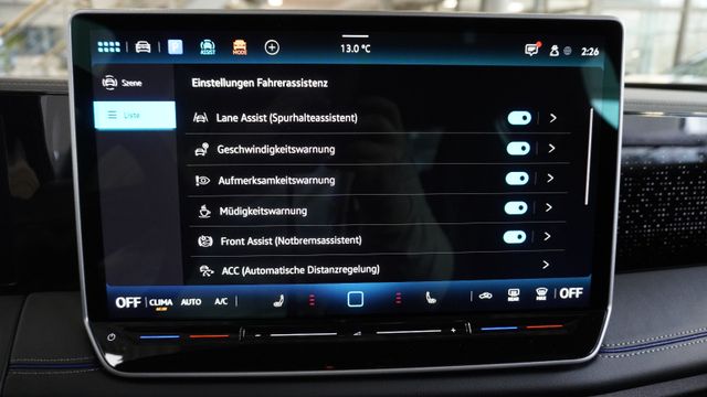 • Fahrassistenz-System: Abbiegebremsfunktion und Ausweichunterstützung, Ablenkungs- und Müdigkeitserkennung, Autom. Distanzregelung (ACC inkl. Stop&Go-Funktion), Berganfahr-/Abfahr-Assistent, Berganfahr-Assistent, Fahrprofilauswahl, Fernlichtregulierung (Light Assist), Kreuzungs-Assistent, Notbremsassistent Front assist mit Fußgänger- und Fahrraderkennung, Parklenkassistent (Park Assist Plus) inkl. Einparkhilfe vorn und hinten, Spurwechselassistent (Side Assist) mit Auspark-Assistent und Ausstiegswarnung, Verkehrszeichenerkennung Fahrerlebnisschalter inkl. Innenraumerlebnis Atmospheres
